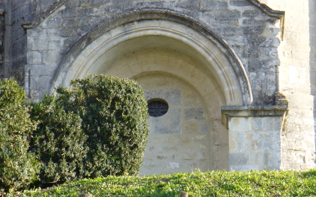 addition d’un porche formant façade à l’abside septentrionale. Au centre s’ouvre une porte ogivale qui a été murée ; 2 colonnes triangulaires, dont le tympan est occupé par un bel écusson, sculpté en relief ; il est inscrit dans une rosace à quatre lobes comme celles que l’on rencontre sur les monnaies de cette époque ;